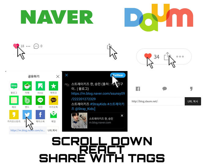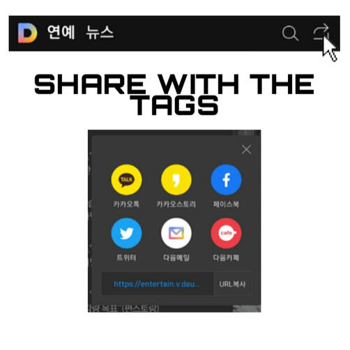 Para los artículos de DAUM puedes compartirlo en tus redes sociales o hacer un NAVER BLOG, siempre con los tags